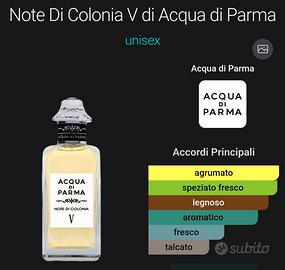 Note Di Colonia VdiAcqua di Parmaè una fragranza del gruppo Legnoso Aromatico unisex.Note Di Colonia Vè stato lanciato sul mercato nel 2020. Le note di testa sono Bergamotto di Calabria, Limone e Pepe Rosa; le note di cuore sono Zenzero e Ginepro; le note di base sono Legno di Cedro e Sandalo. Usato pochi spruzzi no boxe solo profumo