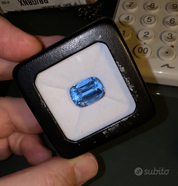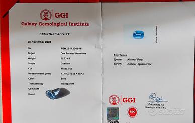 Vendo da collazione Acquamarina naturale di grande dimensione e colore eccezionale, selezionata per intensità cromatica, trasparenza e presenza scenica. Una gemma importante, pensata per alta gioielleria o collezione, con un blu profondo e luminoso non comune per questa caratura. Si tratta di una acquamarina naturale (berillo) da 15,73 carati, taglio cushion mixed, con colore blu intenso e saturo, definibile senza esitazioni come “blu vero”, brillante e pulito alla vista. La pietra è trasparente, con caratteristiche coerenti con l’origine naturale. Il trattamento è solo termico (heated), dichiarato e ammesso nel commercio gemmologico, utilizzato esclusivamente per migliorare e stabilizzare il colore, senza alterare la natura della gemma. Dettagli della gemma (da report GGI) • Specie: Berillo naturale • Varietà: Acquamarina naturale • Taglio: Cushion – Mixed Cut • Peso: 15,73 ct • Misure: 17,19 × 12,66 × 10,42 mm • Colore: Blu • Trasparenza: Trasparente • Trattamento: Heated (solo calore) • Oggetto: Gemma sciolta Certificazione • GGI – Galaxy Gemological Institute Report gemmologico incluso, con identificazione e dichiarazione del trattamento. Informazioni aggiuntive • Acquamarina di caratura importante • Colore blu intenso e molto raro per dimensione • Ideale per anello importante o pendente • La pietra in foto è esattamente quella in vendita • Massima trasparenza gemmologica Spedizione e dogana • Spedizione assicurata e tracciabile • Imballaggio professionale • Ritiro a mano possibile • Eventuali oneri fiscali a carico dell’acquirente Nota fotografica Foto reali della gemma. Eventuali lievi variazioni di colore possono dipendere da luce o display. Note personale Acquistata in Pakistan e fatta ritagliare per ottenere la massima lucentezza possibile, perdendo oltre 3 carati. Fornisco anche altra certificazione originale nella misura precedente.