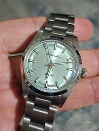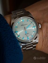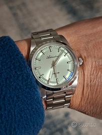 Orologio molto carino, con 38 mm di diametro cassa, quadrante color verde menta con bellissimi riflessi, vetro minerale bombato di ottima qualità, movimento seiko vh31, bracciale da 20 mm con clasp loggata e 5 microregolazioni, ottima luminescenza con bgw9, resistenza all'acqua 100 metri, l'orologio è nuovo, completo di tutto, spedizione da me gestita con posta prioritaria tracciabile, consegna in un giorno...