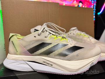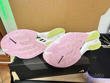 Vendo fantastiche Adidas Adizero Boston 12, colorazione White/Solar Yellow, taglia 42 2/3 (US 9 / UK 8.5). Caratteristiche: • Condizioni ottime, (vedi foto dettagliate della suola e degli interni) • Intersuola in Lightstrike Pro per un'ammortizzazione reattiva e leggera • Tomaia in mesh traspirante per il massimo comfort • Suola Continental™ per un grip eccezionale su qualsiasi superficie.