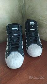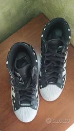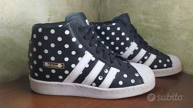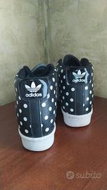 Vendo sneakers Adidas alte nere con pois bianchi, modello stile Superstar / Pro Model con puntale in gomma bianco con zeppa interna.