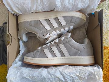 Vendo Adidas Campus 00s, taglia 39%, nuove e mai utilizzate (deadstock). Colore grigio con dettagli bianchi, in pelle scamosciata, complete di etichette originali e lacci di scorta. Scatola originale Adidas blu inclusa, con lievi danni agli angoli e schiacciamenti (vedi foto). Ideali per stile casual o collezionismo. (scatola abbastanza rovinata ma scarpe mai indossate e con tutte le etichette ancora attaccate)