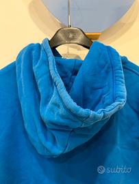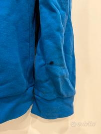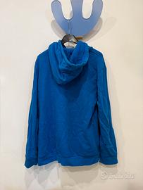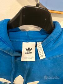 Felpa Adidas Originals blu con cappuccio, taglia S. Realizzata in cotone. Presenta il logo Adidas Originals bianco sul davanti. Usata, in buone condizioni. Nota: è presente una macchia scura sul braccio e una leggera scoloritura sui bordi del cappuccio.