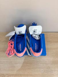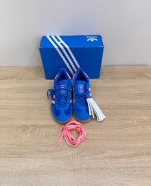 Scarpe Adidas Gazelle Indoor in camoscio blu con dettagli rosa.