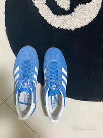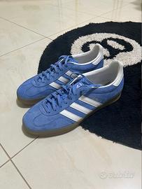 Vendo iconiche Adidas Gazelle Indoor nella splendida colorazione Blue Fusion, un azzurro vibrante che si abbina perfettamente a ogni outfit casual o sportivo. Il modello si distingue per la classica tomaia in suede (scamosciato) di alta qualità e la caratteristica suola in gomma (gum sole) semitrasparente, che dona un tocco vintage e ricercato. Dettagli principali: • Modello: Adidas Gazelle Indoor • Colore: Blue Fusion / Cloud White / Gum • Taglia: 43 1/3 (EU) • Condizioni: [Pari al nuovo]