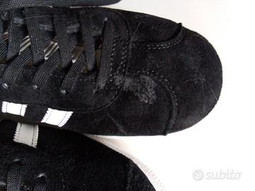 Iconiche sneakers Adidas Gazelle in camoscio nero con dettagli bianchi. - Tomaia in camoscio. - Strisce laterali a contrasto. - Logo Gazelle dorato sul lato - Un leggero alone sulla punta della scarpa sinistra. - Lavate e igienizzate.