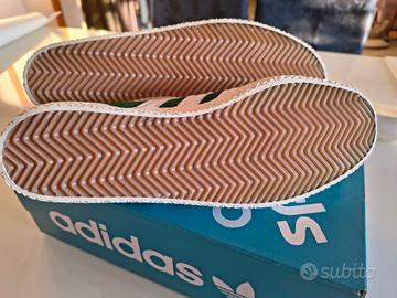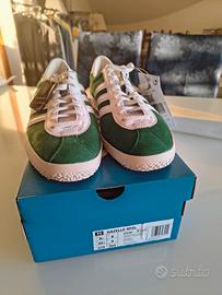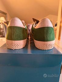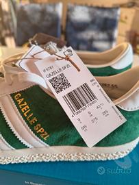 Scarpe Adidas Gazelle SPZL in camoscio verde scuro con dettagli bianchi. Modello nuovo. Edizione limitata di un modello iconico e di tendenza quale Gazelle. Collaborazione con SPZL in versione Gold edition. Spezial è uno stile Urban in voga tra tifosi e appassionati di calcio rendendo ogni outfit distintivo e di carattere. I dettagli della suola le cuciture premium - le linguette con il doppio brand e il retro in pelle rendono speciali questo modello rispetto ai modelli tradizionali