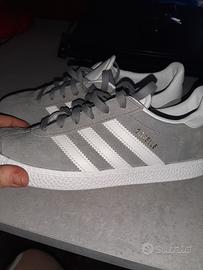 vendo scarpe adidas gazzelle grigie Nuove mai messe . vestono 36/37 . pagate e 110. molto fini nr 36. e anche scarpa color oro quasi nuova in vera pelle comprata da Tassinari a 180 e . vendo a 50 .