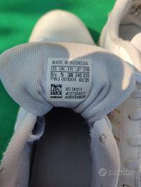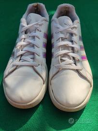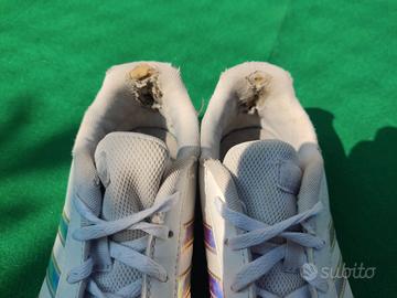 Sneakers/Scarpe donna in eco-pelle bianca ed inserti multicolore cangiante. Presentano segni di usura nei talloni. La pelle e integra. Taglia 38.