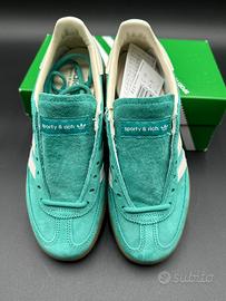 Adidas collabora con Sporty & Rich per presentare una speciale edizione della silhouette Handball Spezial in una raffinata tinta verde. Questa nuova collaborazione unisce l'eleganza di Sporty & Rich con l'iconico design sportivo di Adidas, creando un prodotto unico nel suo genere.