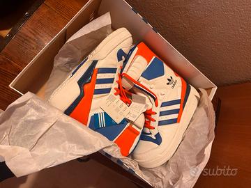 Vendo rarissime Adidas Originals by Jeremy Scott modello JS Snow Boots - Rare Collector's Piece - G00935 Un pezzo di storia dello streetwear, frutto della collaborazione "Originals by Originals". Queste sneakers ultra-high top fondono l'estetica di uno scarpone da sci con il DNA Adidas. • Condizioni: Ottime, mai indossate / pari al nuovo (come da foto). Complete di scatola originale e tag. • Colore: White / Satellite / Orange (Bianco, Blu, Arancione). • Taglia: * UK 8.5 • US 9 (Uomo) • FR 42 2/3 • JP 270 • Dettagli: Tomaia in pelle di alta qualità, chiusura a strappo oversize sulla caviglia con firma Jeremy Scott, lacci arancioni a contrasto.