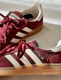 Dotate di tomaia in velluto a coste bordeaux con motivo a tre strisce bianche e tomaia in pelle scamosciata, queste scarpe offrono un look retrò ed elegante. Progettate per i giocatori di pallamano nel 1979, si propongono di trasmettere un look elegante e raffinato.