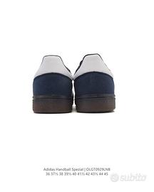 Le adidas Originals Handball Spezial sono delle sneaker basse comode, resistenti e antiscivolo. Questa classica scarpa retrò è unisex e presenta un design a T con la scritta "Speziala" stampata in oro. La tomaia è realizzata in un materiale con pannelli in pelle, perfetta per l'autunno e l'inverno. Nuove di zecca e consegnate nella loro scatola. Sorprendi la persona amata! Spediamo il giorno successivo all'acquisto.
