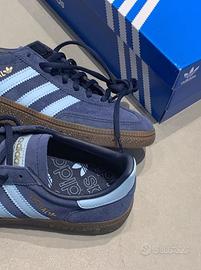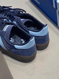 Le adidas Originals Handball Spezial sono delle sneaker basse comode, resistenti e antiscivolo. Questa classica scarpa retrò è unisex e presenta un design a T con la scritta "Speziala" stampata in oro. La tomaia è realizzata in un materiale con pannelli in pelle, perfetta per l'autunno e l'inverno. Nuove di zecca e consegnate nella loro scatola. Sorprendi la persona amata!