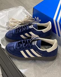 Le adidas Originals Handball Spezial sono delle sneaker basse comode, resistenti e antiscivolo. Questa classica scarpa retrò è unisex e presenta un design a T con la scritta "Speziala" stampata in oro. La tomaia è realizzata in un materiale con pannelli in pelle, perfetta per l'autunno e l'inverno. Nuove di zecca e consegnate nella loro scatola. Sorprendi la persona amata!