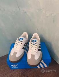 Vendo Adidas Originals Samba colore bianco con strisce nere e suola marrone.