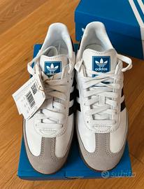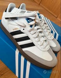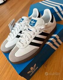 Vendo Adidas Originals Samba colore bianco con strisce nere e suola marrone, modello iconico molto richiesto.