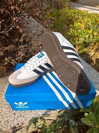 Vendo Adidas Originals Samba colore bianco con strisce nere e suola marrone, modello iconico molto richiesto dagli appassionati di sneakers.