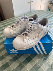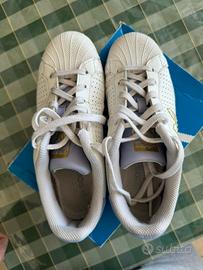 Scarpe Adidas superstar w di colore bianco. Misura F 39 1/3 - US 7 1/2 - UK 6 - D 6 - J 245 CHN 240. Sono state indossate poco, presentano un piccolo foro nell’imbottitura in una scarpa, si trova nella zona del tallone.
