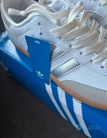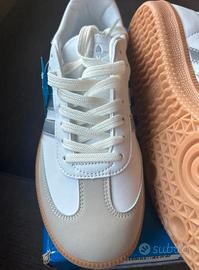 Vendo Adidas Samba, nuovissime, mai indossate! Con un design elegante e moderno, queste scarpe sono ideali per chi cerca comfort e stile. Le iconiche tre strisce argentate su fondo bianco rendono queste scarpe uniche e perfette per ogni occasione casual.