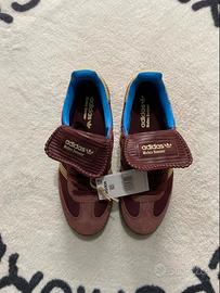 The Wales Bonner Fox Brown adidas Samba Nylon showcases the British brand's contemporary interpretation of a classic. The low-profile silhouette boasts a Fox Brown nylon upper with a matching forefoot overlay in textured suede. Tan leather accents adorn the iconic 3-Stripes and rear tab. Adding a touch of contrasting color, blue nylon lines the collar. The lateral heel proudly displays 'Wales Bonner,' while dual branding graces the sock liner and fold-over tongue. A robust gum rubber cupsole forms the foundation of the sneaker.