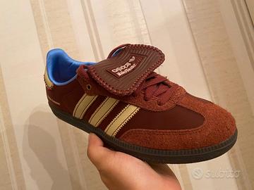 The Wales Bonner Fox Brown adidas Samba Nylon showcases the British brand's contemporary interpretation of a classic. The low-profile silhouette boasts a Fox Brown nylon upper with a matching forefoot overlay in textured suede. Tan leather accents adorn the iconic 3-Stripes and rear tab. Adding a touch of contrasting color, blue nylon lines the collar. The lateral heel proudly displays 'Wales Bonner,' while dual branding graces the sock liner and fold-over tongue. A robust gum rubber cupsole forms the foundation of the sneaker.