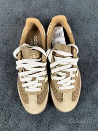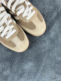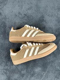 This version of the adidas Samba OG comes in a unique Cardboard and Brown Desert colorway. The upper is made of brown woven mesh, which allows for breathability and style. Suede overlays in a Cardboard color line the toebox and run up the middle of the shoe and underneath the laces. The typical three stripes logo appears on the midsole in white leather and also on the heel collar. An adidas logo patch can be found stamped onto the tongue in a lighter brown color. The rubber outsole shares the Brown Desert colorway.