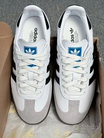 Crafted from full-grain leather, the upper of the Cloud White Core Black adidas Samba OG offers a sturdy and resilient construction. A gray suede, paired with a contrasting black heel tab, introduces an element of sophistication to the overall design. The iconic serrated 3-Stripes appear in black on both the lateral and medial sides, creating a visually striking contrast. Enhancing the shoe's unique identity, a Bluebird tongue label and a foil logotype mark its distinctive DNA. Underneath, a brown gum rubber outsole ensures both traction and durability, underscoring the shoe's practicality and style.