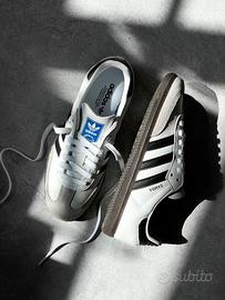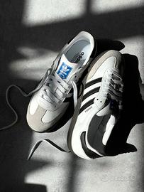 Crafted from full-grain leather, the upper of the Cloud White Core Black adidas Samba OG offers a sturdy and resilient construction. A gray suede, paired with a contrasting black heel tab, introduces an element of sophistication to the overall design. The iconic serrated 3-Stripes appear in black on both the lateral and medial sides, creating a visually striking contrast. Enhancing the shoe's unique identity, a Bluebird tongue label and a foil logotype mark its distinctive DNA. Underneath, a brown gum rubber outsole ensures both traction and durability, underscoring the shoe's practicality and style.