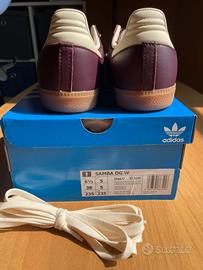 Colorway e Stile: silhouette Samba iconica in elegante bordeaux, inserti cream white e dettagli oro metallici. Prodotto femminile, ricercato da collezioniste.