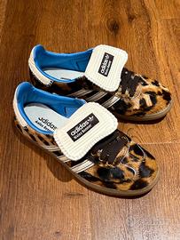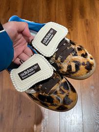 The upper base and overlays of the adidas Samba Pony Wales Bonner Leopard are luxe leather in a caramel and dark brown marbled pattern reminiscent of a leopard. The heel tab and tongue that fold over the laces are both creamy white leather that matches the signature three stripes along the side panel. The heel tab and tongue sport exaggerated looped stitching and the three stripes feature dark brown stitching. The textile sockliner is light blue while the insole is creamy white. This distinctive-looking upper rests upon a gum rubber sole unit patterned for traction and impact absorption.