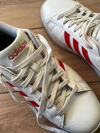 Adidas sneakers originali per uomo, usate in discrete condizioni con segni di usura e suola parzialmente scolorita, senza scatola. Colorazione bianca con strisce rosse e logo su sfondo nero, chiusura con lacci. Taglia 44 come da indicazioni dell’etichetta in foto