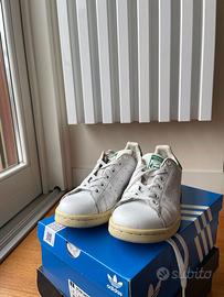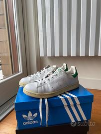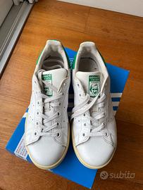 Adidas Stan Smith, un modello iconico in pelle bianca con dettagli verdi sul tallone.