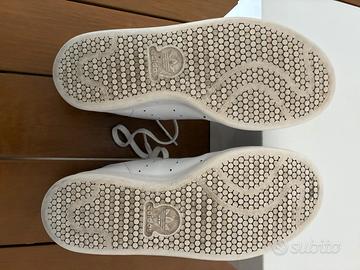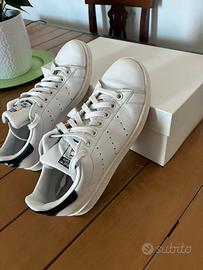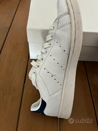 Adidas Stan Smith originali, colore bianco con tallone blu navy. Taglia: 40.5 Condizioni: usate poco, pelle morbida, unico difetto piccola usura scarpa sinistra come mostrato nella foto. Disponibile per consegna a mano in zona Castelli Romani. No scatola