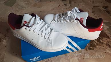 Mitiche Stan Smith con finiture amaranto /rosso , usate una sola volta per prova. Vendo con scatola originale per taglia errata .
