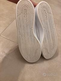 Adidas Stan Smith, tomaia in pelle bianca con linguetta e tallone verdi, suola in gomma in perfette condizioni. Usate pochissimo.