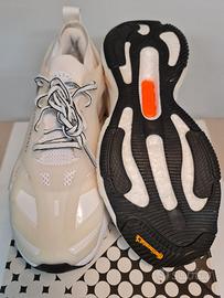 Scarpe da running bianche con dettagli arancioni nella suola con lacci bianchi bordati di nero.