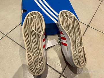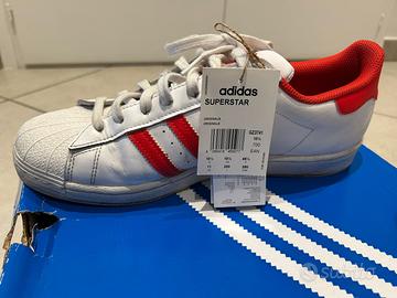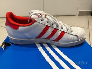 Vendo paio di sneakers Adidas Superstar taglia 45 e 1/3 in colorazione bianco e bande rosse. Il prodotto è stato utilizzato poco e conservato con cura (ha anche le etichette come potete vedere dalle foto). Vendo al prezzo di € 35, contattatemi se interessati, no perditempo.
