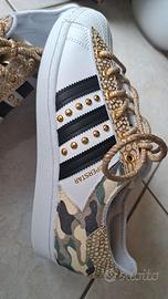 Adidas Superstar Lady Camo, sneakers personalizzata da donna, la parte posteriore della scarpa è ricoperta dal tessuto denim con stanmpa militare mentre il retro e il passalacci sono di pelle stampa pitonata panna e oro, il tutto è rifinito dalle borchie tonde oro tra le righe e dal laccio perfettamente abbinato in corda panna con laminature oro.