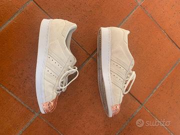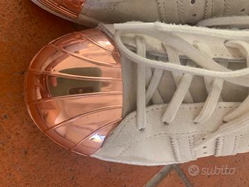 Vendo Adidas Superstar modello medal toe con punta oro rosa in taglia 39 1/3 (va bene x un 38.5/39). Le scarpe sono in crosta beige (tipo camoscio). Indossate pochissime volte e tenute bene, le punte non hanno sgraffi.