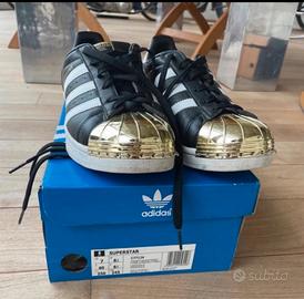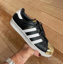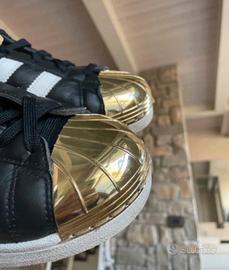 VEDI BENE LE FOTO! le cuciture davanti un po’ allentate! Adidas Superstar nere con righe bianche e punta metallica oro con scatola #adidas #adidasoriginals #adidassuperstar #superstarnereoro #adidasoro