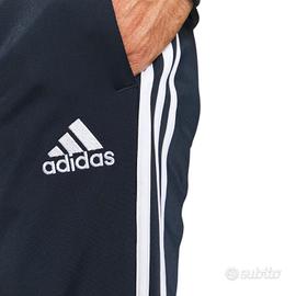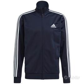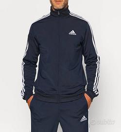 tuta adidas indossata solo per prova , colore blu Marino con strisce bianche 2 pezzi: giacca con zip e tasche laterali e pantaloni sportivi con tasche.