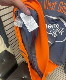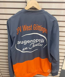 Felpa olimpica Adidas, grigia, fondo arancione, comoda, traspirante, materiali di qualità, tasca interna sul retro.