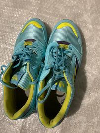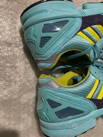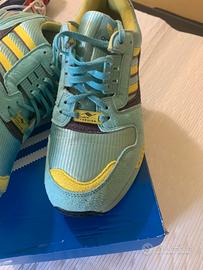 Scarpe Adidas Torsion ZX 8000 in colorazione azzurra e gialla. Numero 45 1/5 - sono usate Sono un 45 ma vestono meno, io di solito ho il 44. La suola interna non é originale. La scatola ha l’etichetta di altre scarpe Adidas - Suola Torsion.
