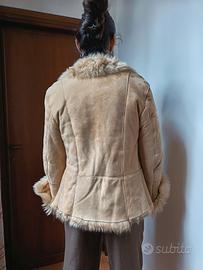Giacca in pelle scamosciata vintage di montone, con autentica pelliccia. Modello afgano color beige, con interno, profili e polsini in morbida pelliccia.