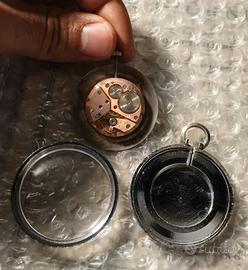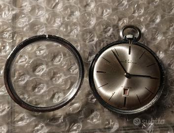 Orologio meccanico da taschino (cipolla) a carica manuale Agir Watch, 17 rubis, movimento svizzero peseux 336N. 43mm di diametro, 9 mm di spessore con tutto il vetro (ultrasottile), calendario rosso che scatta bene al passare della mezzanotte. Le lancette funzionano ma l'orologio è tutto carico, parte per poco e si ferma. Il bilanciere è ok, credo sia una questione di sporcizia degli anni. Esteticamente sta molto bene, ed è molto gradevole da vedere. Peso: 41,2gr.