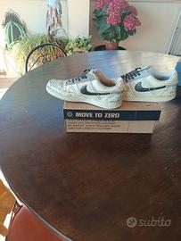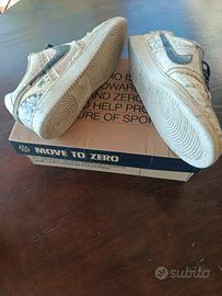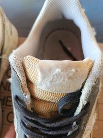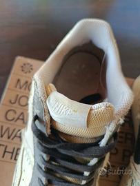 air force costum taglia 44 senza imperfezioni tranne per l'etichetta su una scarpa un po' sbiadita come in foto, presentano un simbolo off White sul lato della scarpa e una barra che si illumina al buio sulla parte superiore oltre al colore giallo e grigio che rendono caratteristica la scarpa.