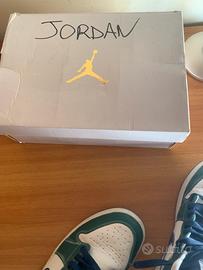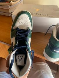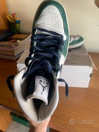 Air Jordan 1 High, colorazione verde scuro, blu navy e bianca. Taglia 42.5. Buone condizioni, con lacci blu navy. Vendo per inutilizzo. Sneaker iconica, ottima occasione per chi cerca una Jordan a prezzo contenuto.
