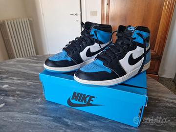 Jordan 1 high retro og colorazione bianca azzurra e nera,