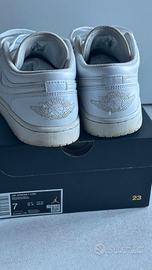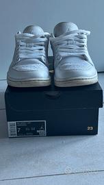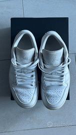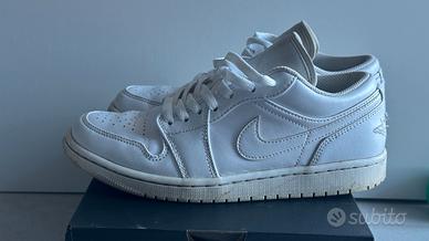 Vendo Air Jordan 1 Low originali, colore bianco. Taglia 40 EU (come da scatola). Condizioni buone, con qualche segno d’uso visibili su punta e suola. Nessun danno strutturale, nessuna rottura. Scarpe comode, sempre tenute con cura. Scatola originale inclusa. Le vendo perché non le metto più.
